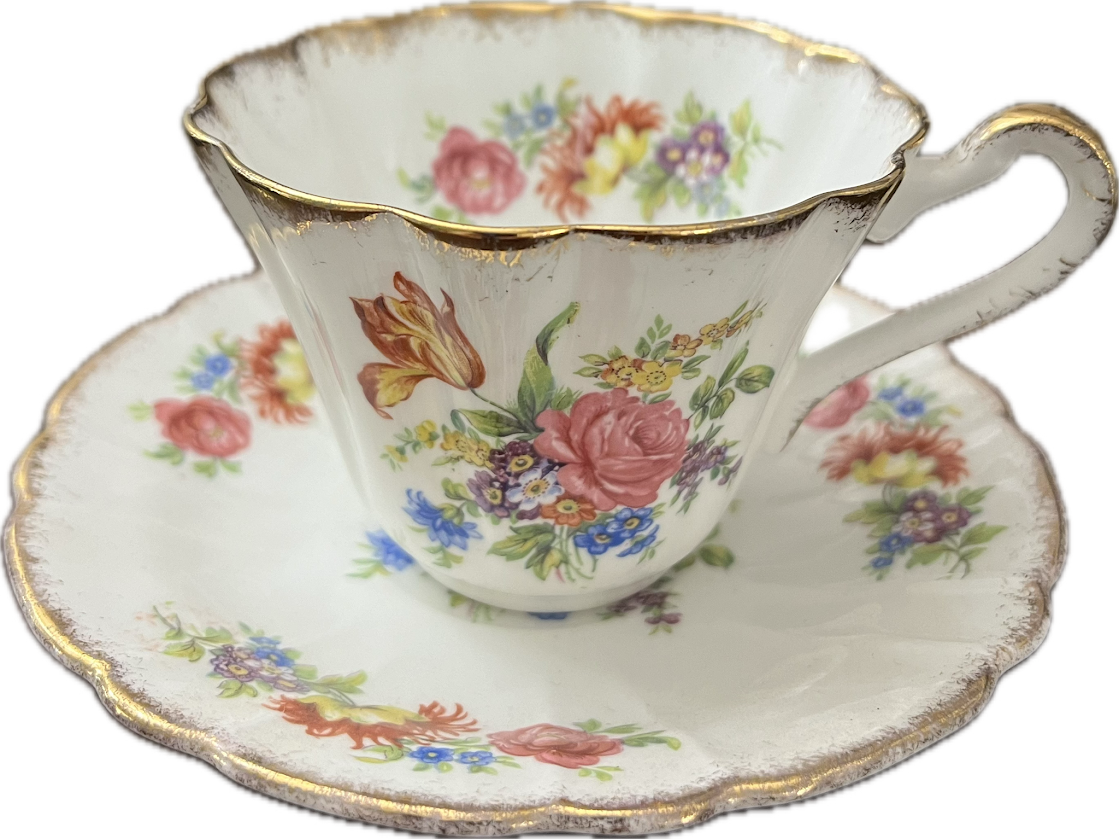 Expertly crafted by Gladstone, the Emory Teacup & Saucer showcases a breathtaking rose and tulip garden bouquet. Boasting a delicate gold trim, this one-of-a-kind set elevates your tea experience.