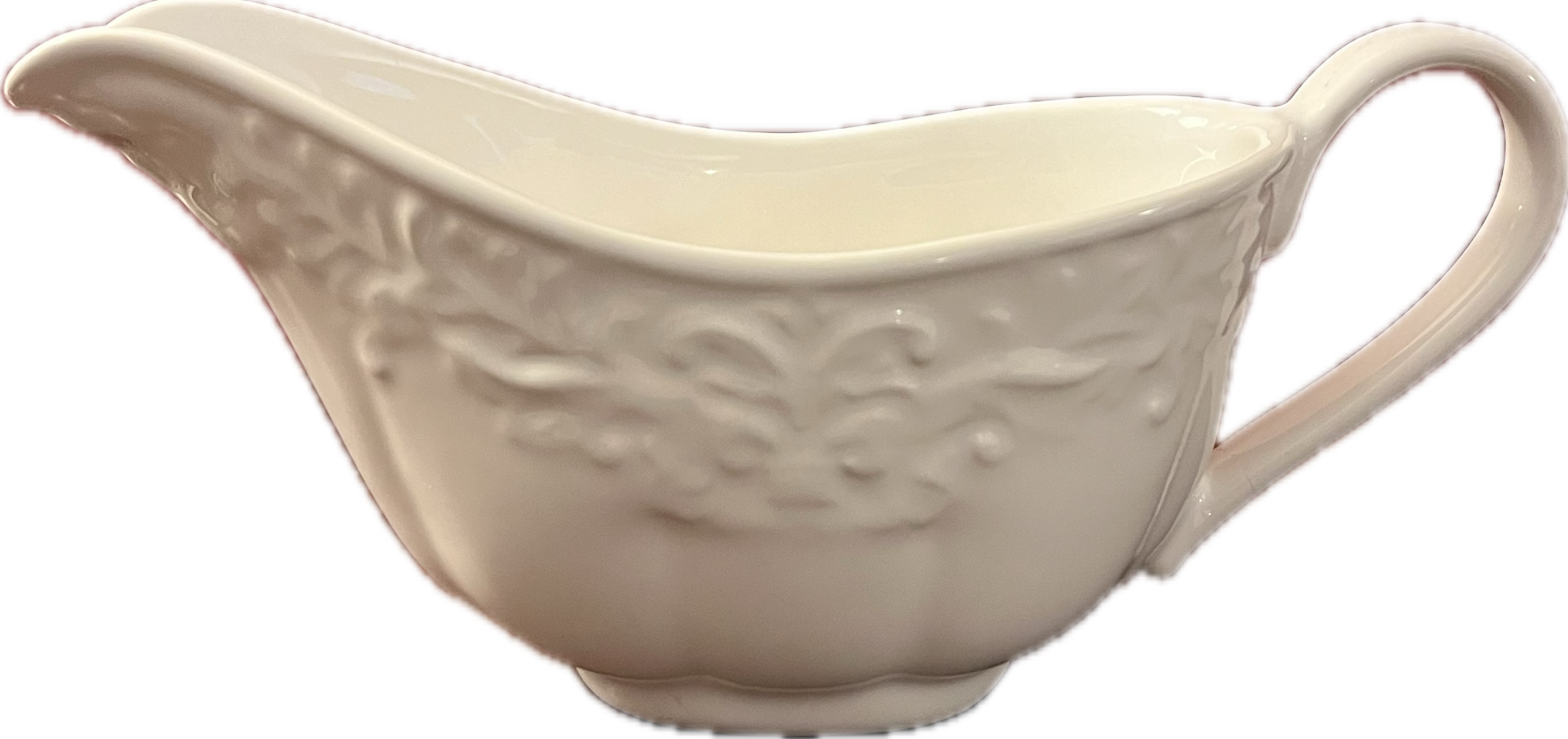 Introducing the elegant Suzanne Gravy Boat - perfect for serving delicious gravies and sauces at your next dinner party. Made with a delicate cream finish and delicate scrollwork, this gravy boat adds a touch of sophistication and style to your dining table.